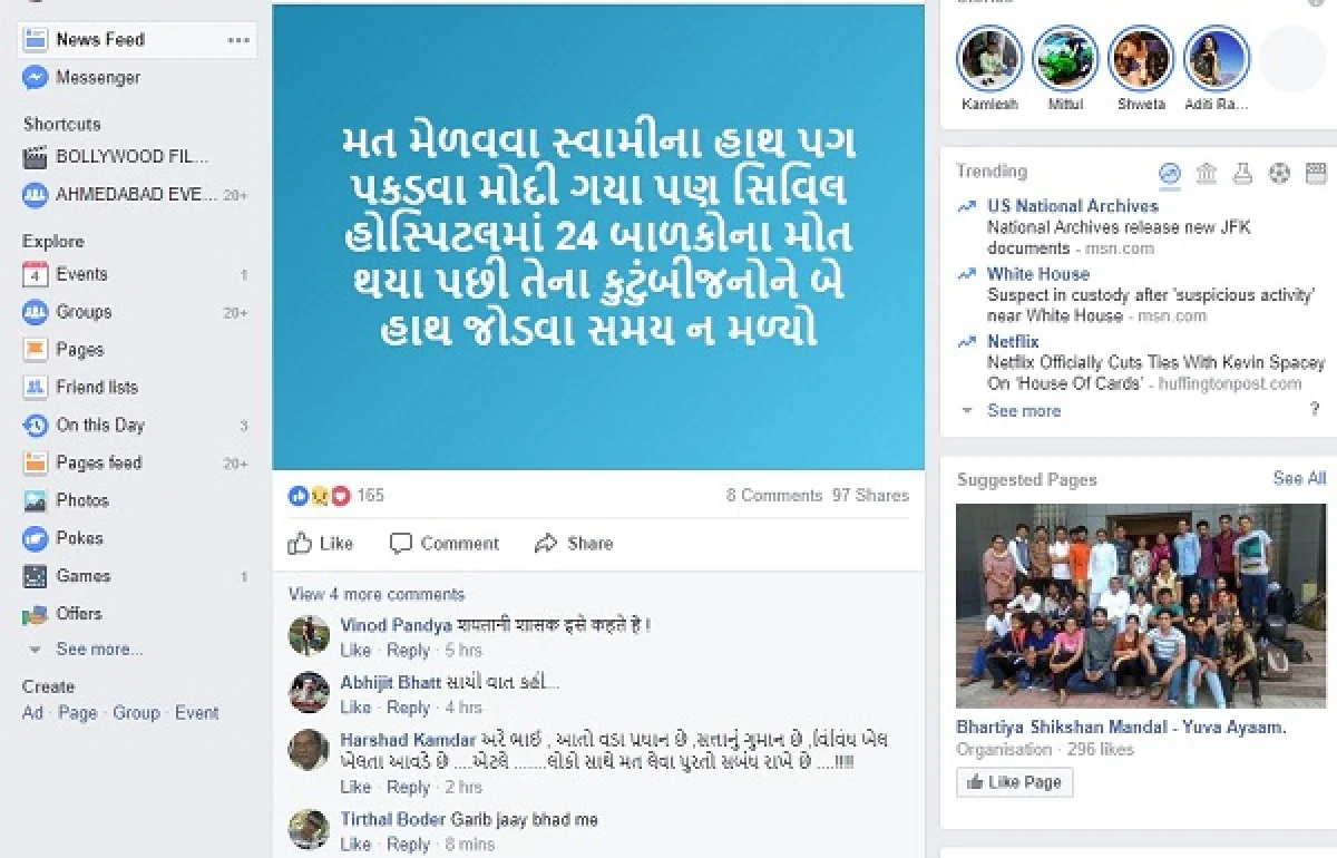 ગાંધીનગર ખાતે બનાવામાં આવેલા સ્વામિનારાયણ અક્ષરધામ મંદિરના રપ વર્ષ પુર્ણ થતાં હોવાથી ઉજવવામાં આવતાં રજતજયંતિ મહોત્સવમાં મુખ્ય મહેમાન તરીકે ભારતના વડાપ્રધાન નરેન્દ્ર મોદી ઉપસ્થિત રહ્યા હતા. તેમણે આ મંદિરમાં પ્રવચન પણ આપ્યું હતું. હવે મોદીની આ મુલાકાત સોશિયલ મીડિયા પર ટ્રોલ થઈ રહી છે. સોશિયલ મીડિયા પર સવાલો ઉઠાવવામાં આવી રહ્યાં છે કે મત મેળવવા સ્વામીના હાથ પગ પકડવા મોદી ગયા પણ સિવિલ હોસ્પિટલમાં 24 બાળકોના મોત થયા પછી તેના કુટુંબીજનોને બે હાથ જોડવા સમય ન મળ્યો. બીજી તરફ એવા પણ સવાલો થઈ રહ્યાં છે કે આ કાર્યક્રમમાં બીએપીએસ દ્વારા બીજા કોઈ પક્ષના નેતાને કેમ આમંત્રણ આપવામાં ના આવ્યું?
