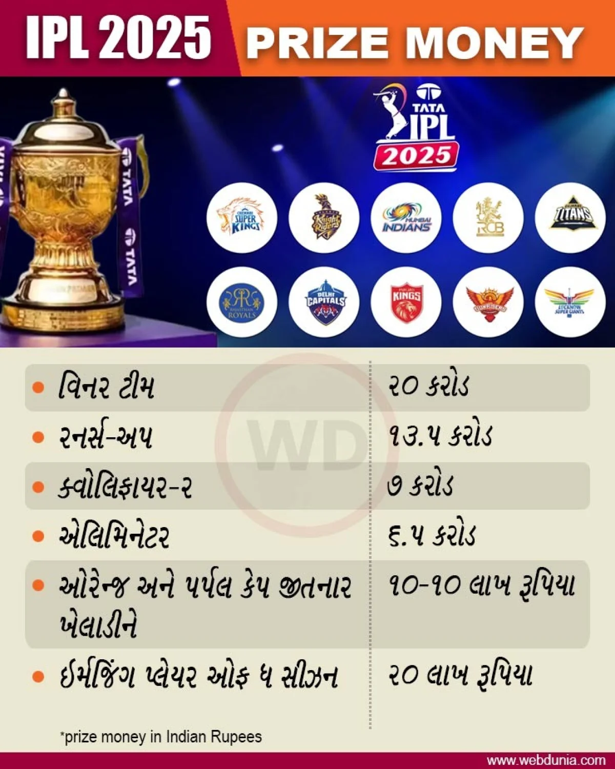 આ ઉપરાંત, ઓરેન્જ કેપ, પર્પલ કેપ, ઇમર્જિંગ પ્લેયર ઓફ ધ સીઝન જેવા ઘણા એવોર્ડ જીતનારા ખેલાડીઓ પર પણ પૈસાનો વરસાદ થાય છે. ઓરેન્જ કેપ અને પર્પલ કેપ જીતનાર ખેલાડીને 10-10 લાખ રૂપિયા મળશે, જ્યારે ઇમર્જિંગ પ્લેયર ઓફ ધ સીઝનનો એવોર્ડ જીતનાર ખેલાડીને 20 લાખ રૂપિયા મળશે.