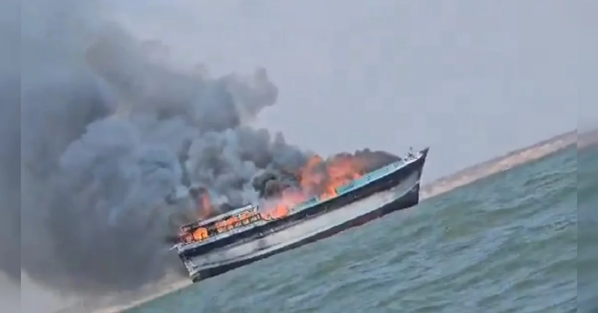 गुजरात कच्छ में समुद्र के बीचों-बीच मांडवी के जहाज में आग लग गई, जहाज सोमालिया बंदरगाह से दुबई जा रहा था, जहाज पर सवार 16 नाविकों को बचा लिया गया...#GujaratiNews #GujaratPolice #Gujarat #Kutch pic.twitter.com/e61tnROPdl